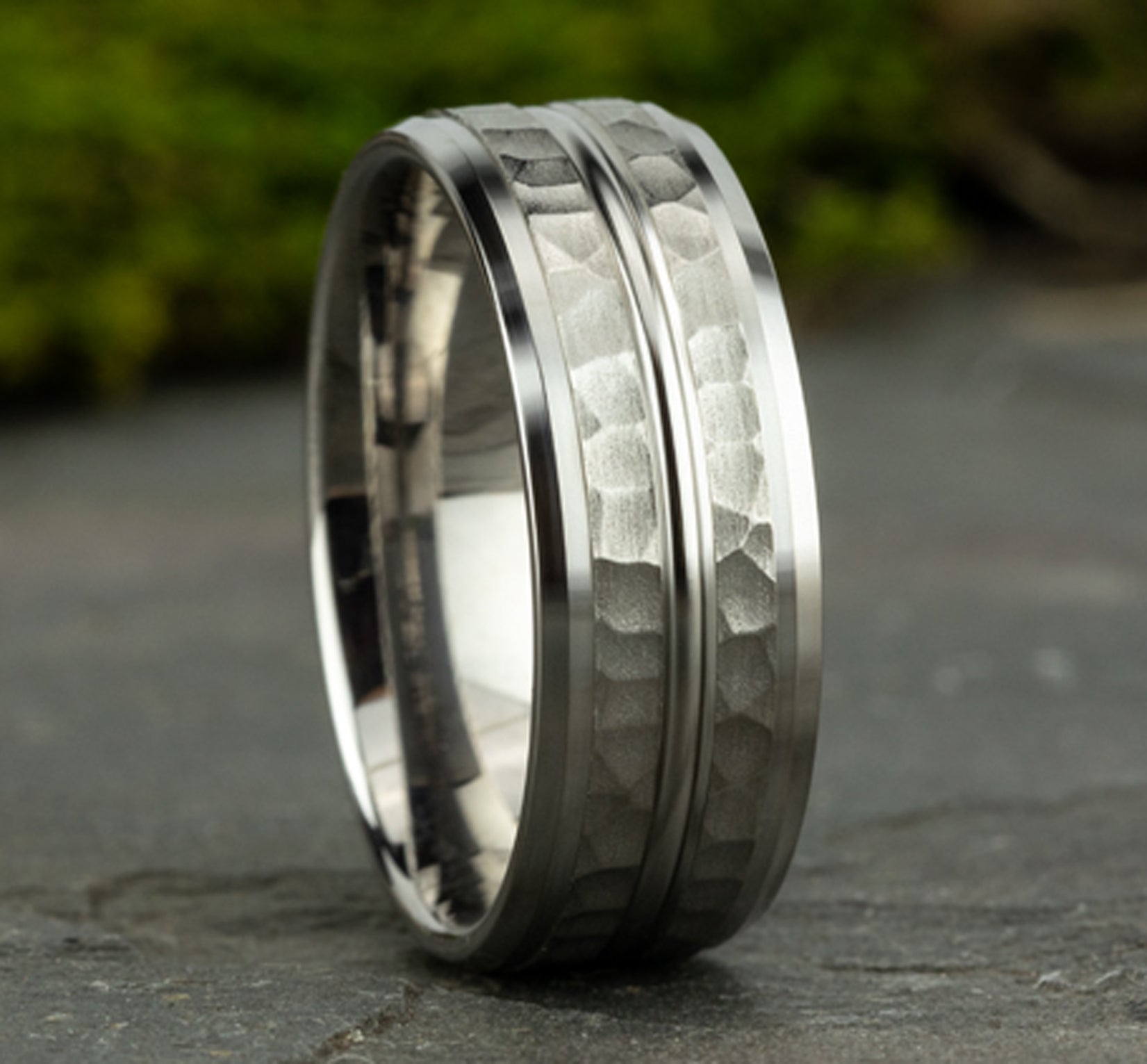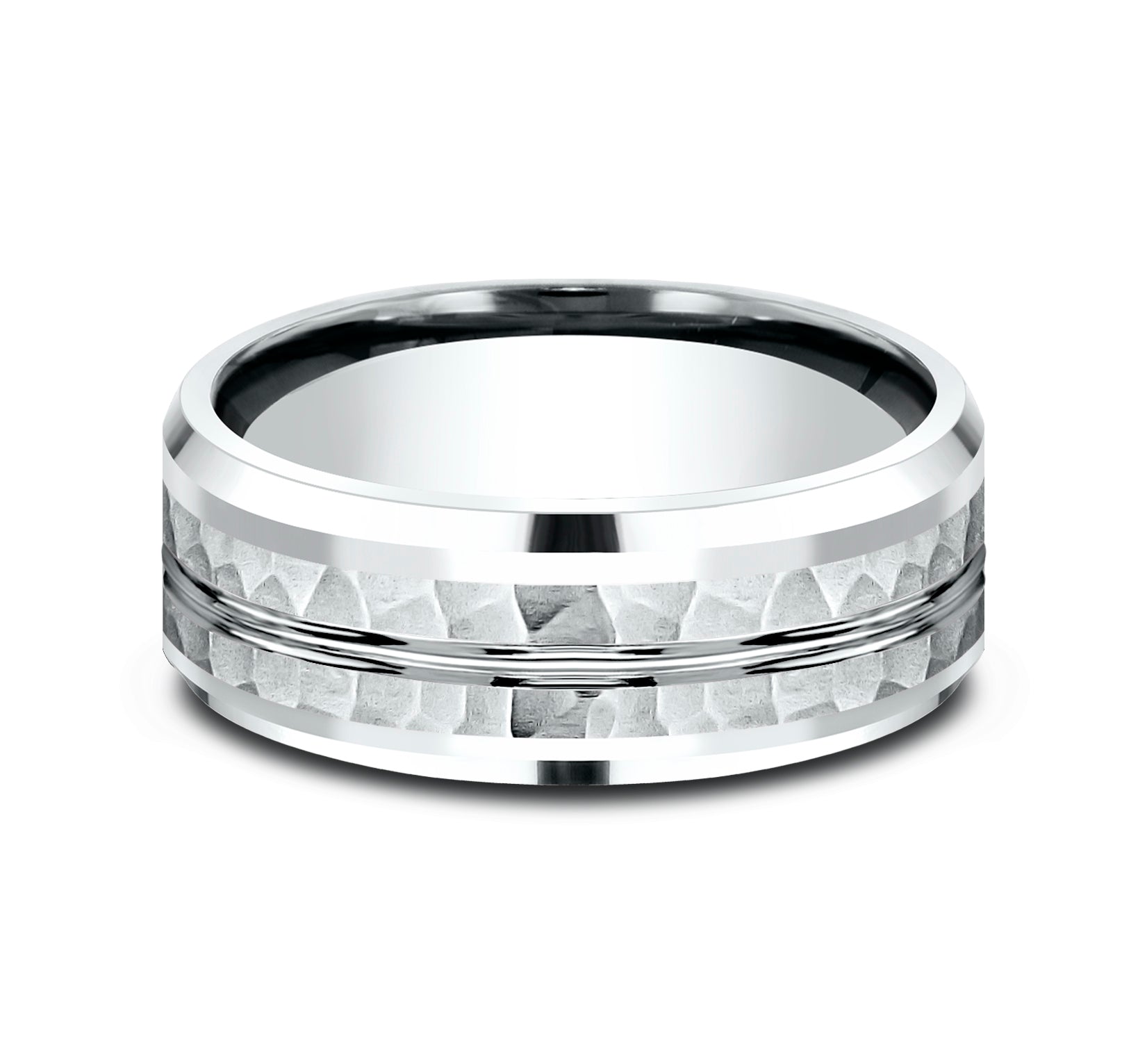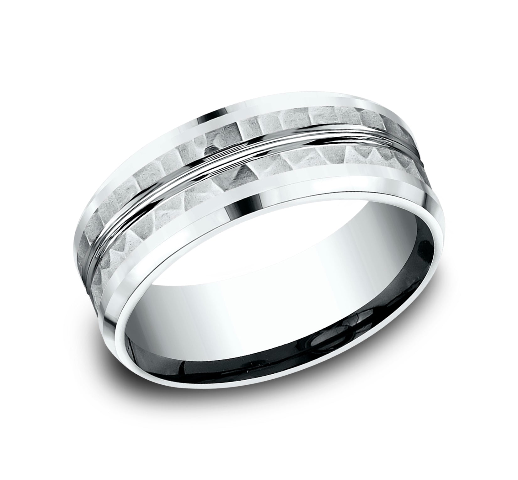 8mm, Comfort fit 14K White Gold Hammered finish, polished center cut and drop bevel edges