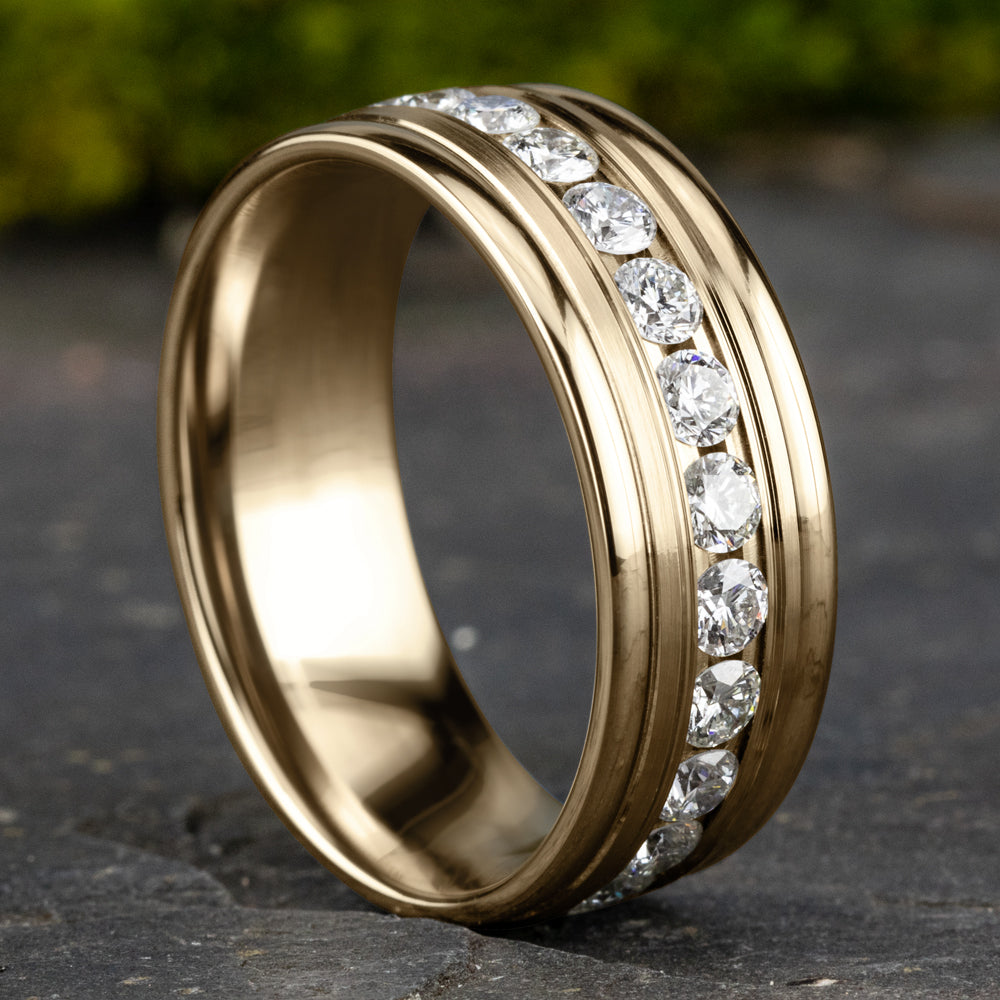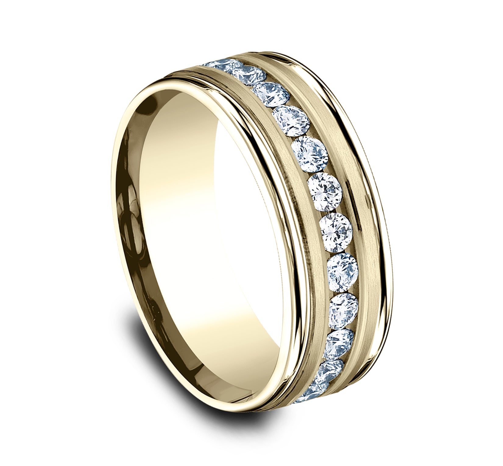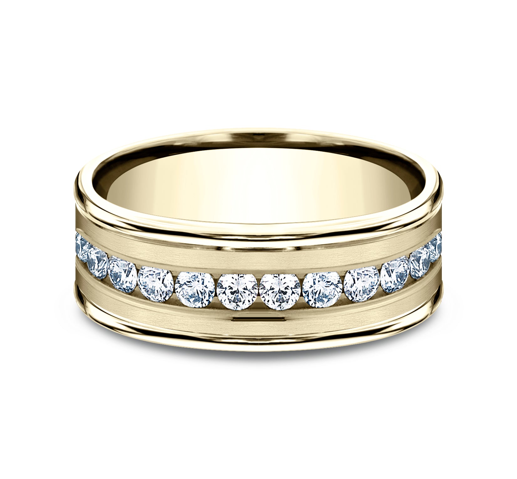 8mm, Comfort fit 14K Yellow Gold Satin center, polished round edges 12 channel set diamonds Carat weight is .96ct Clarity SI1-2, Color GH