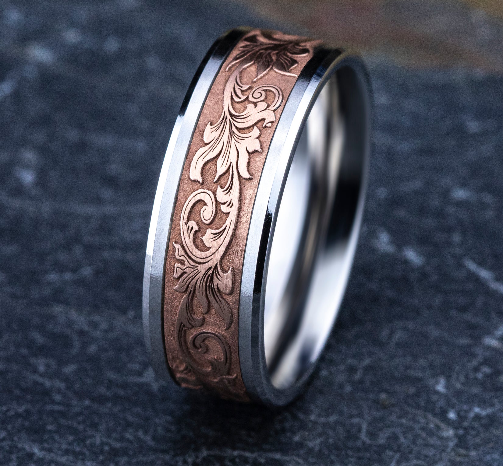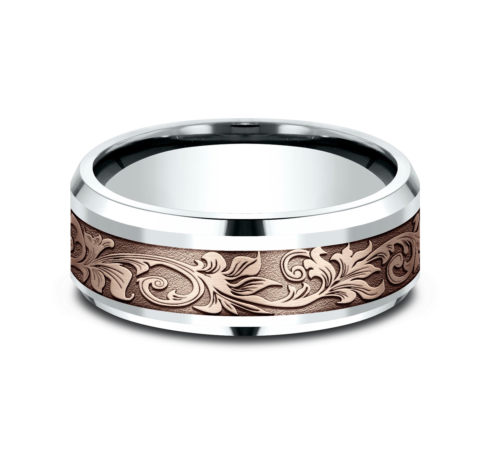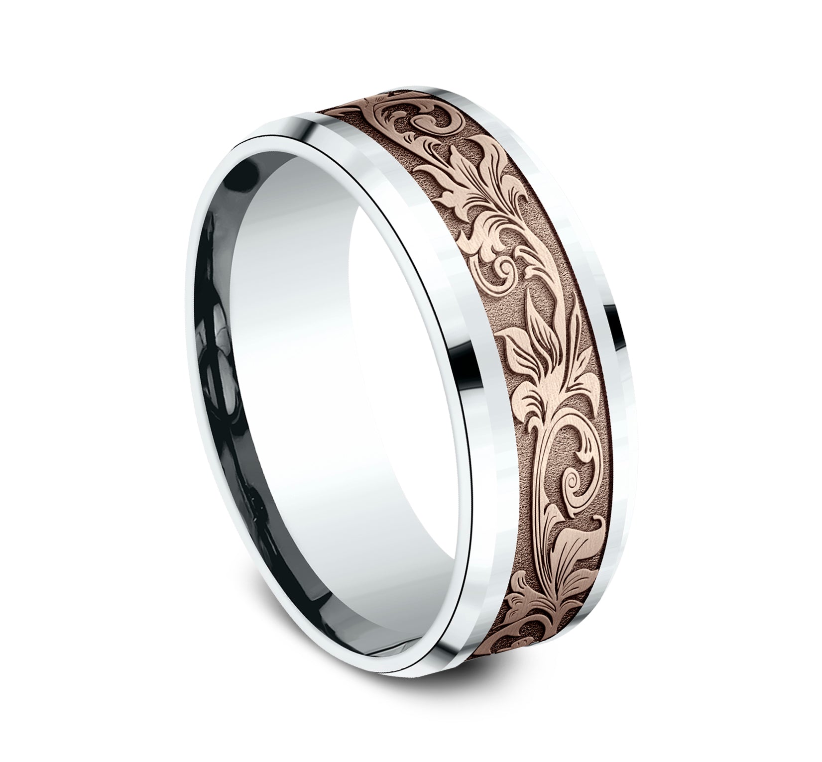 8mm, Comfort fit 14K White and Rose Gold Vintage script pattern, polished drop bevel edges