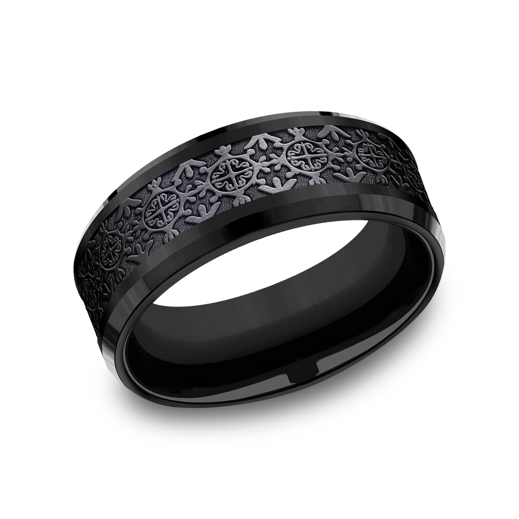 8mm, Comfort fit Black Titanium Intricate patterned center, polished bevel edges