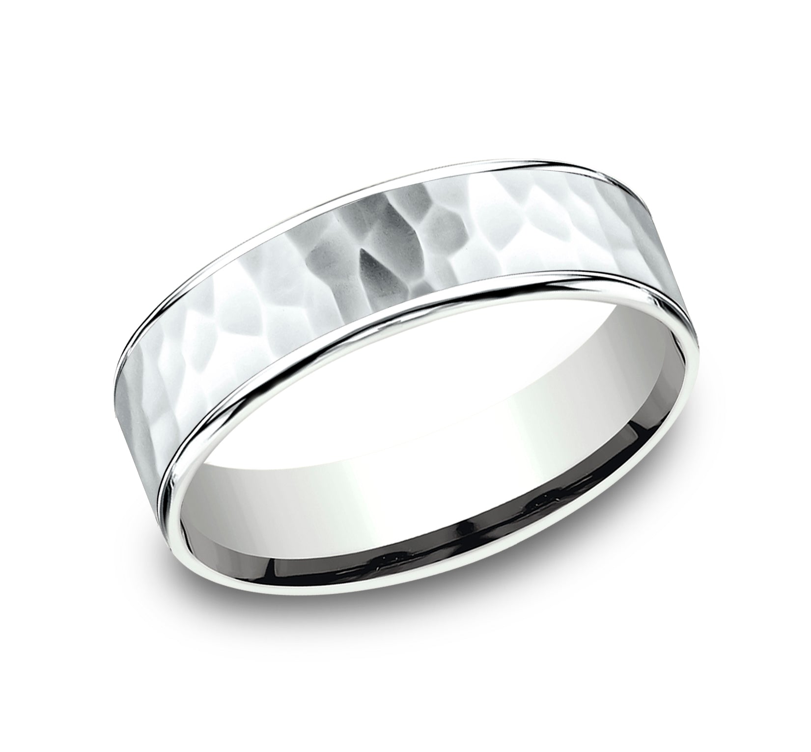 6.5mm, Comfort fit 14K White Gold Hammered center, thin edges