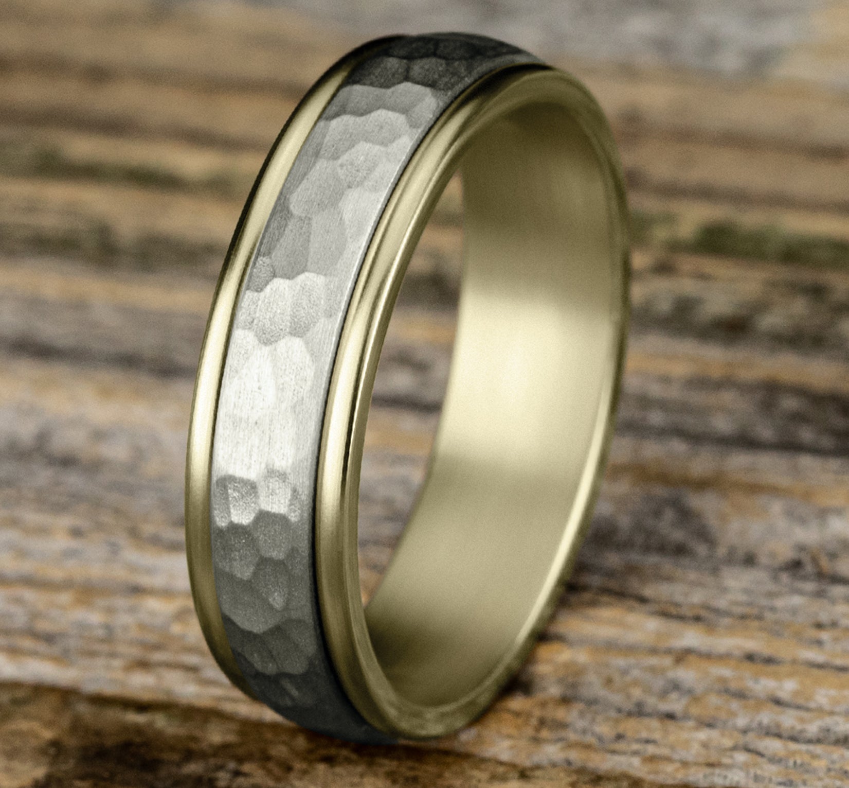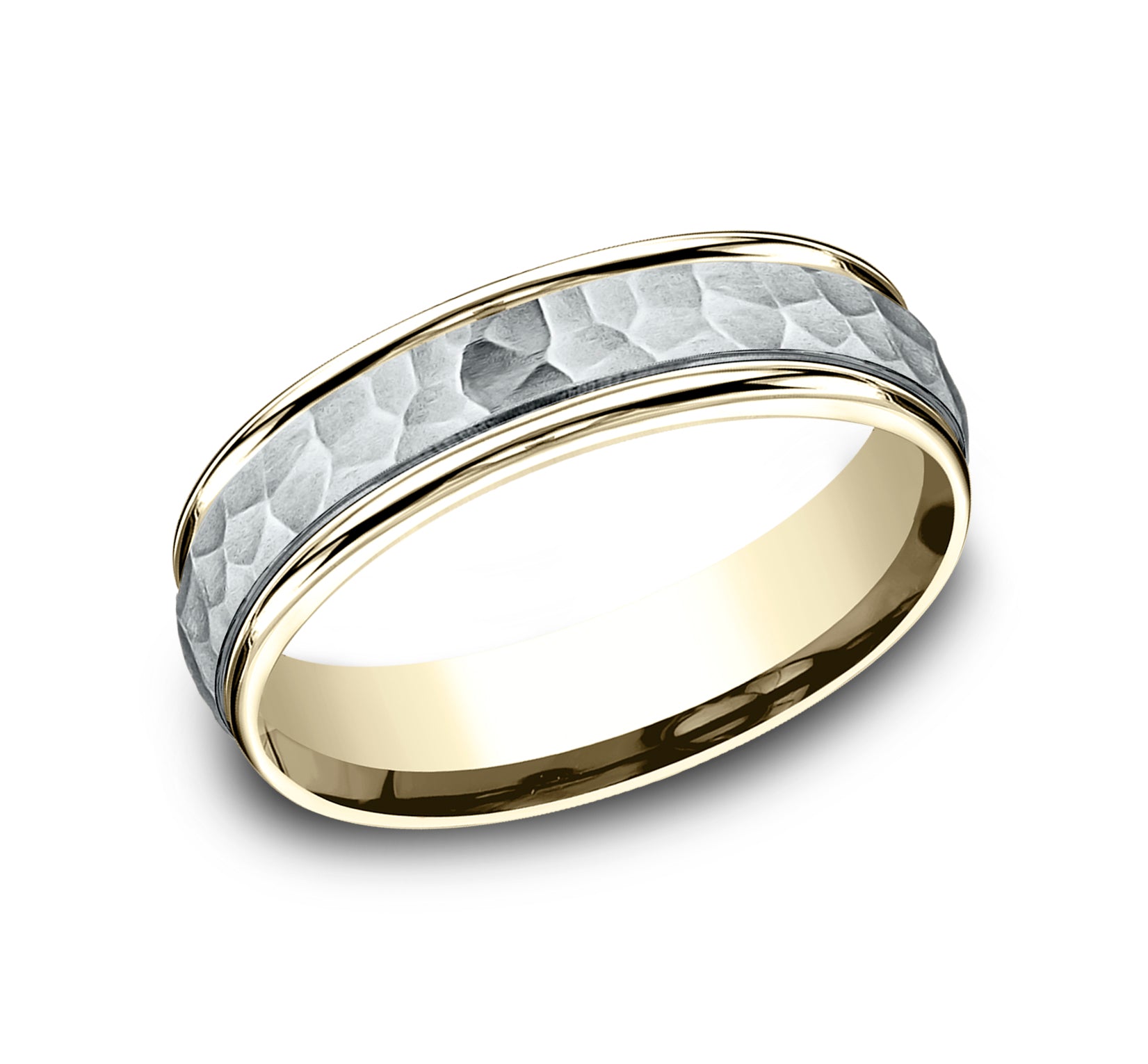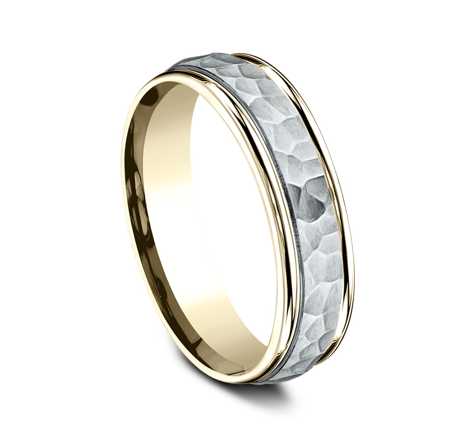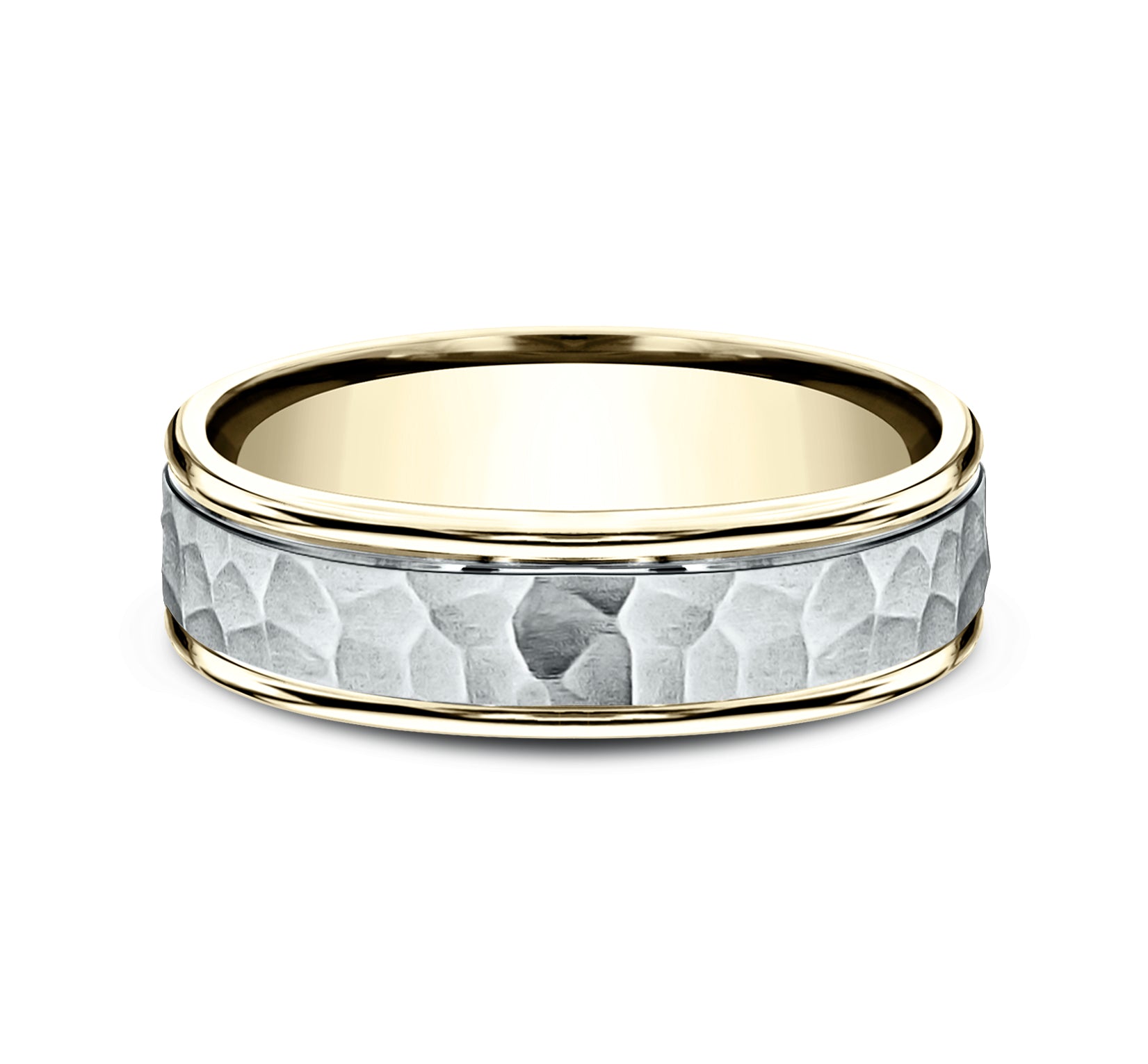 6mm, Comfort fit 14K Yellow and White Gold Hammered center, polished round edges