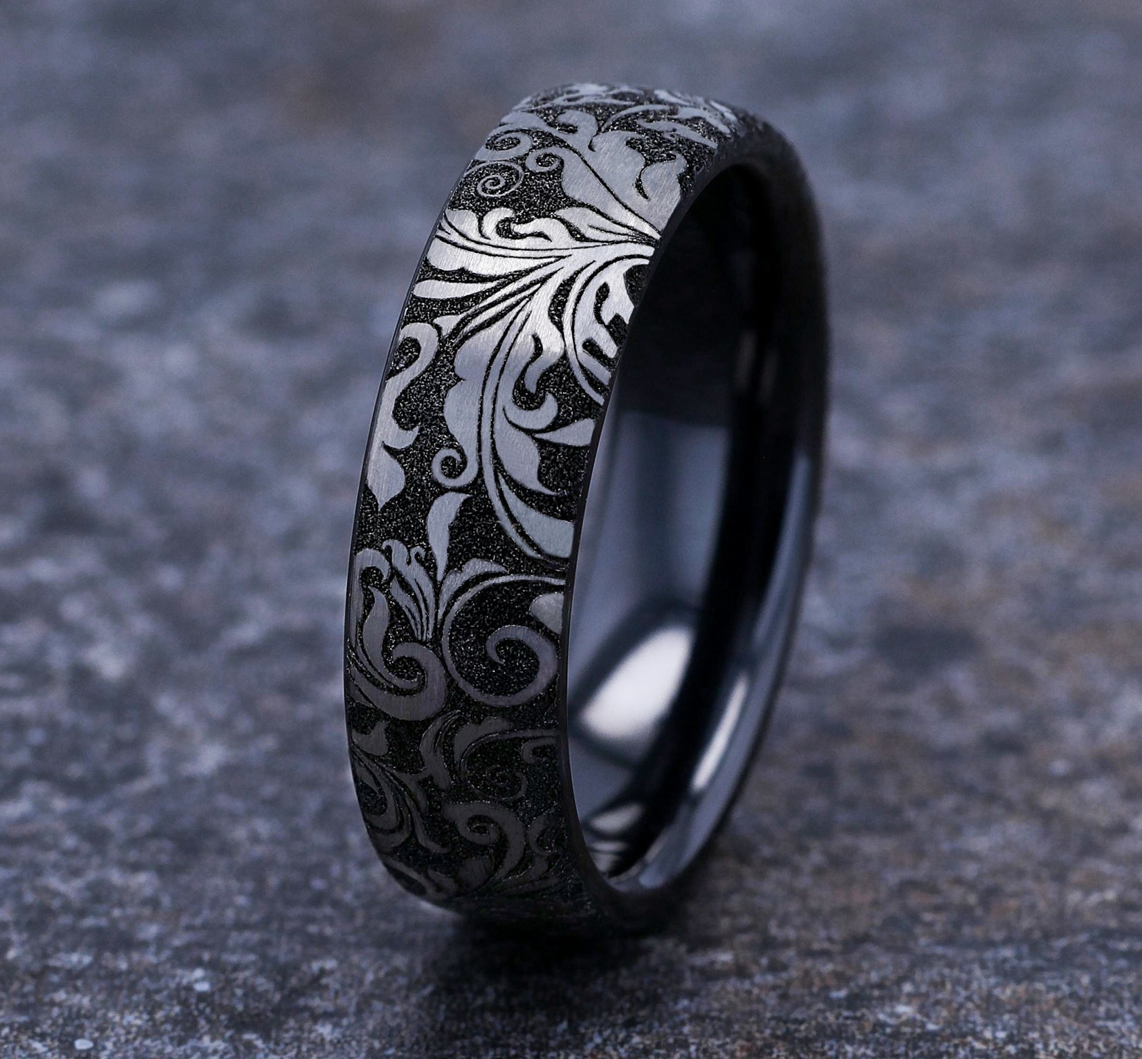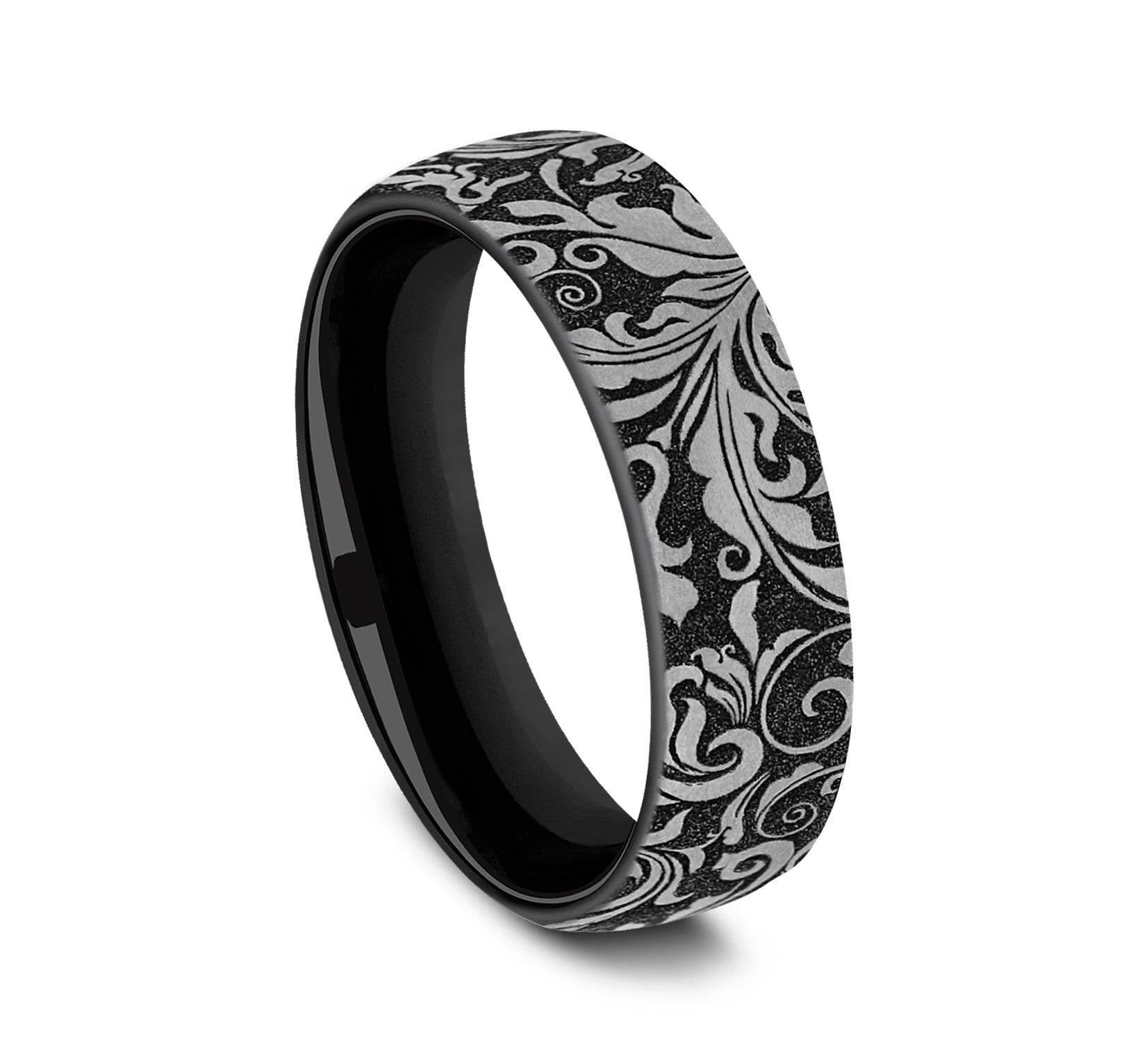 6.5mm, European comfort fit Grey and Black Titanium Leaf script pattern