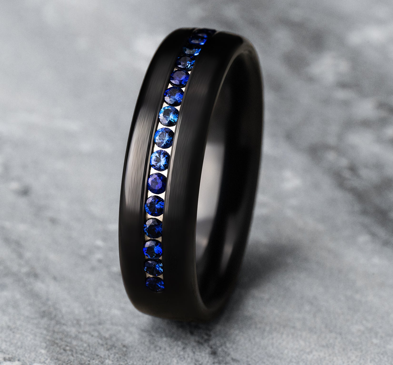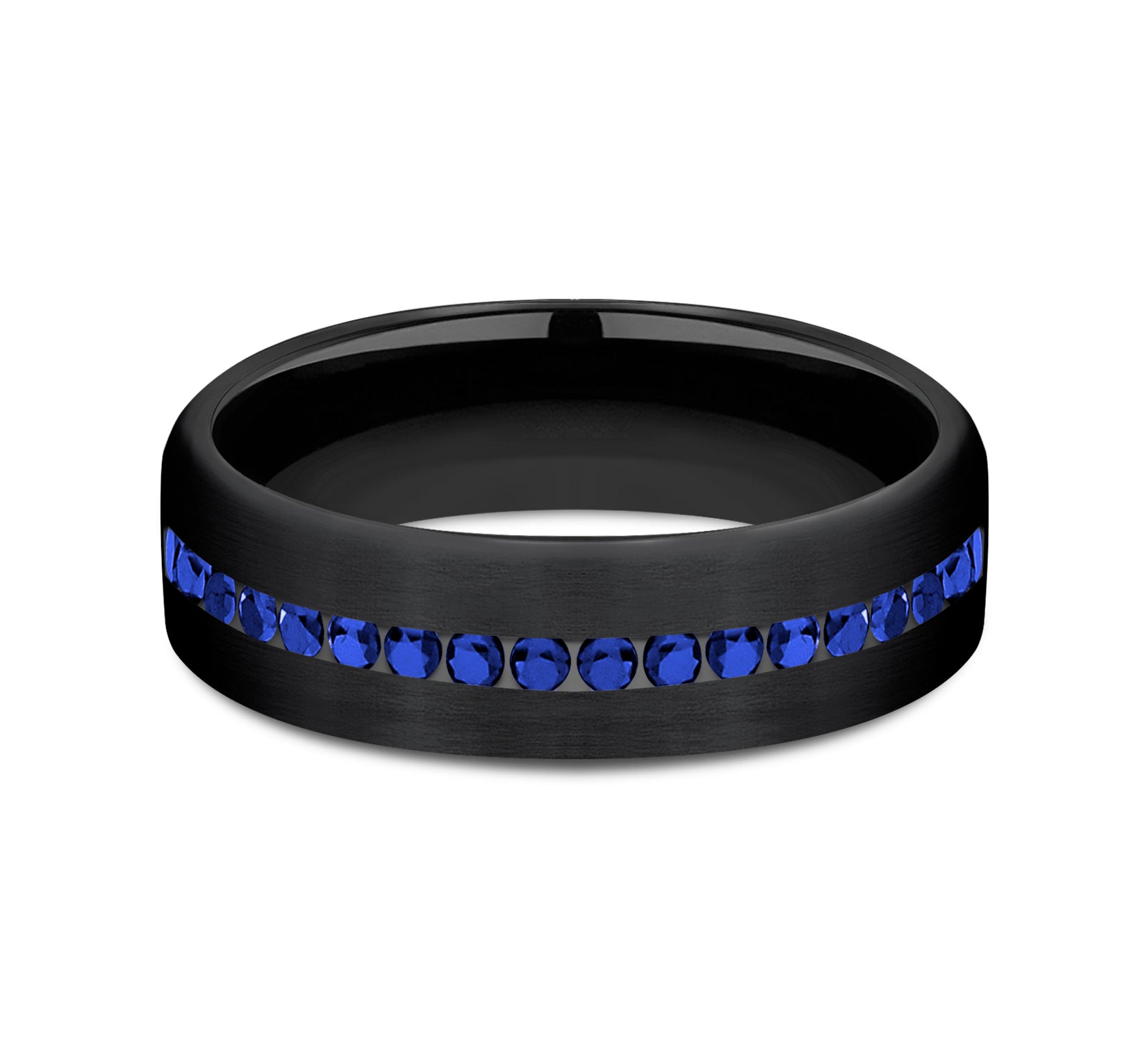 6.5mm, Comfort fit Black Titanium Satin finish 20 channel set blue sapphires Carat weight is .40ct