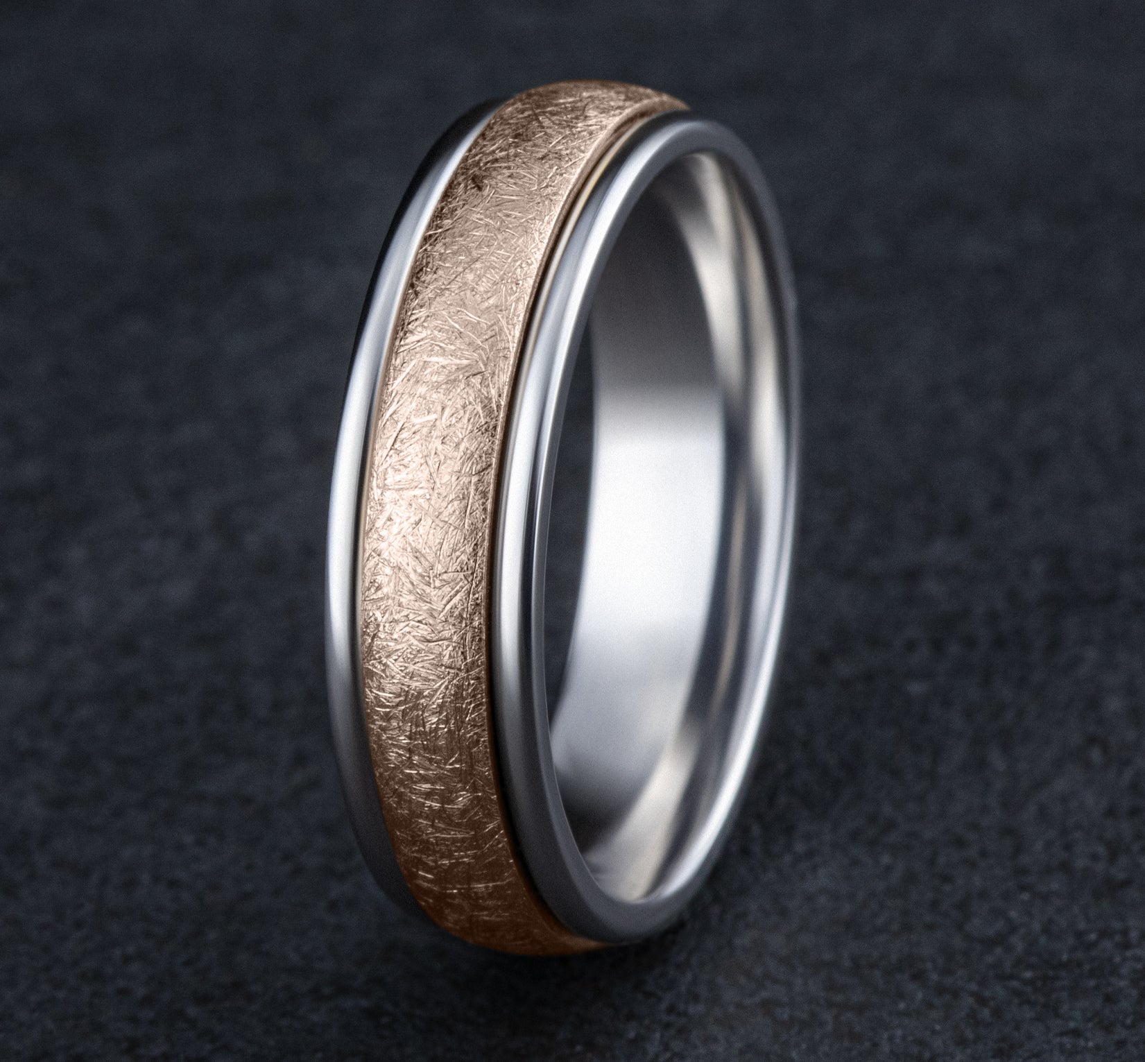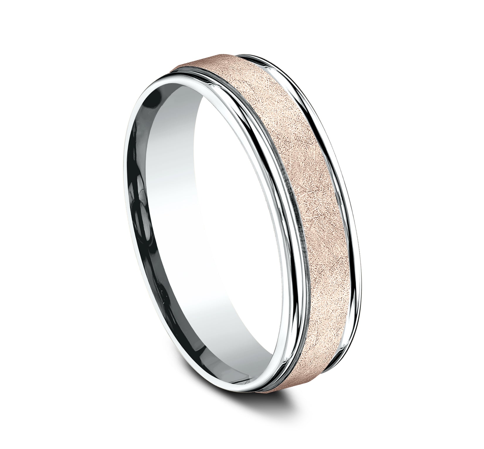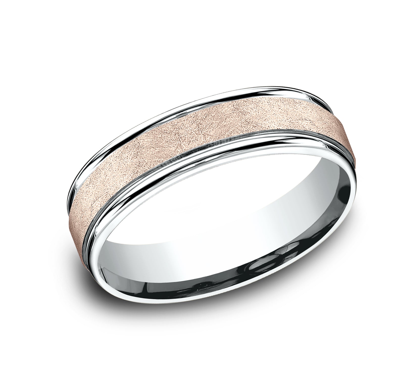 6mm, Comfort fit 14K White and Rose Gold Swirl finish, polished round edges
