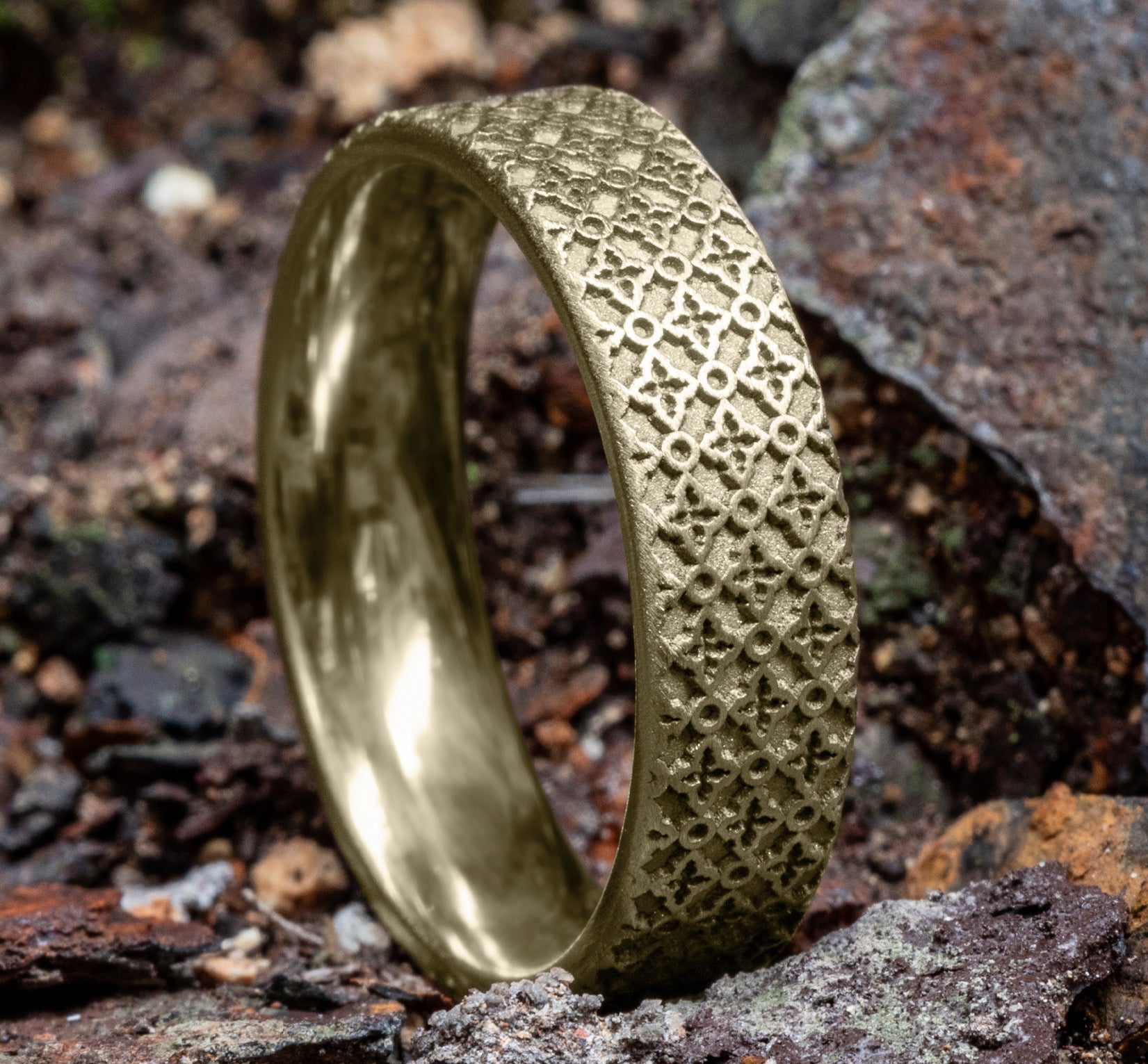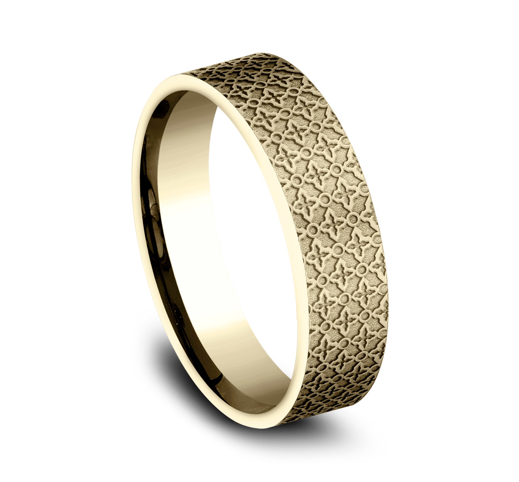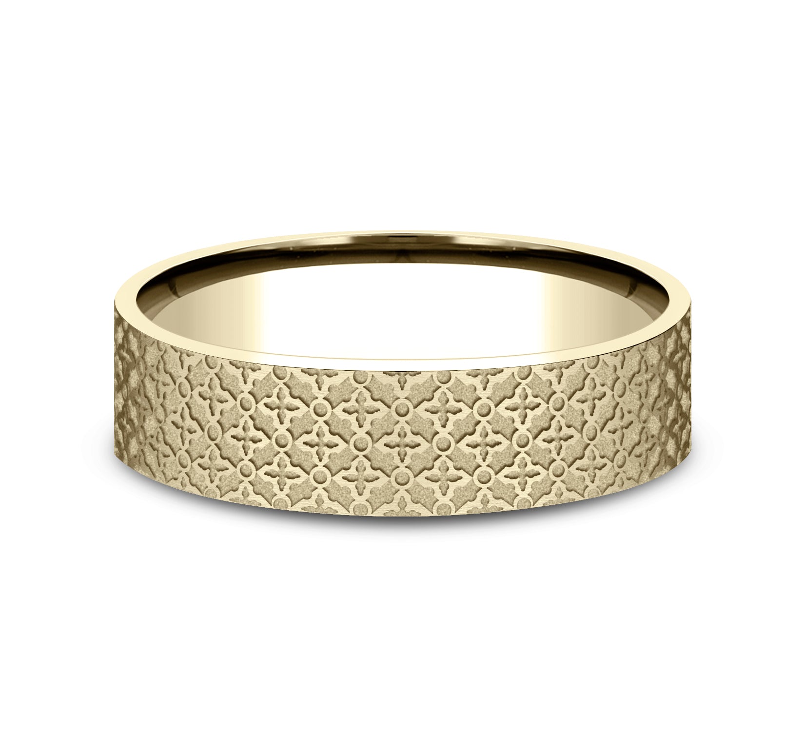 6mm, Comfort fit 14K Yellow Gold Ottoman floral pattern