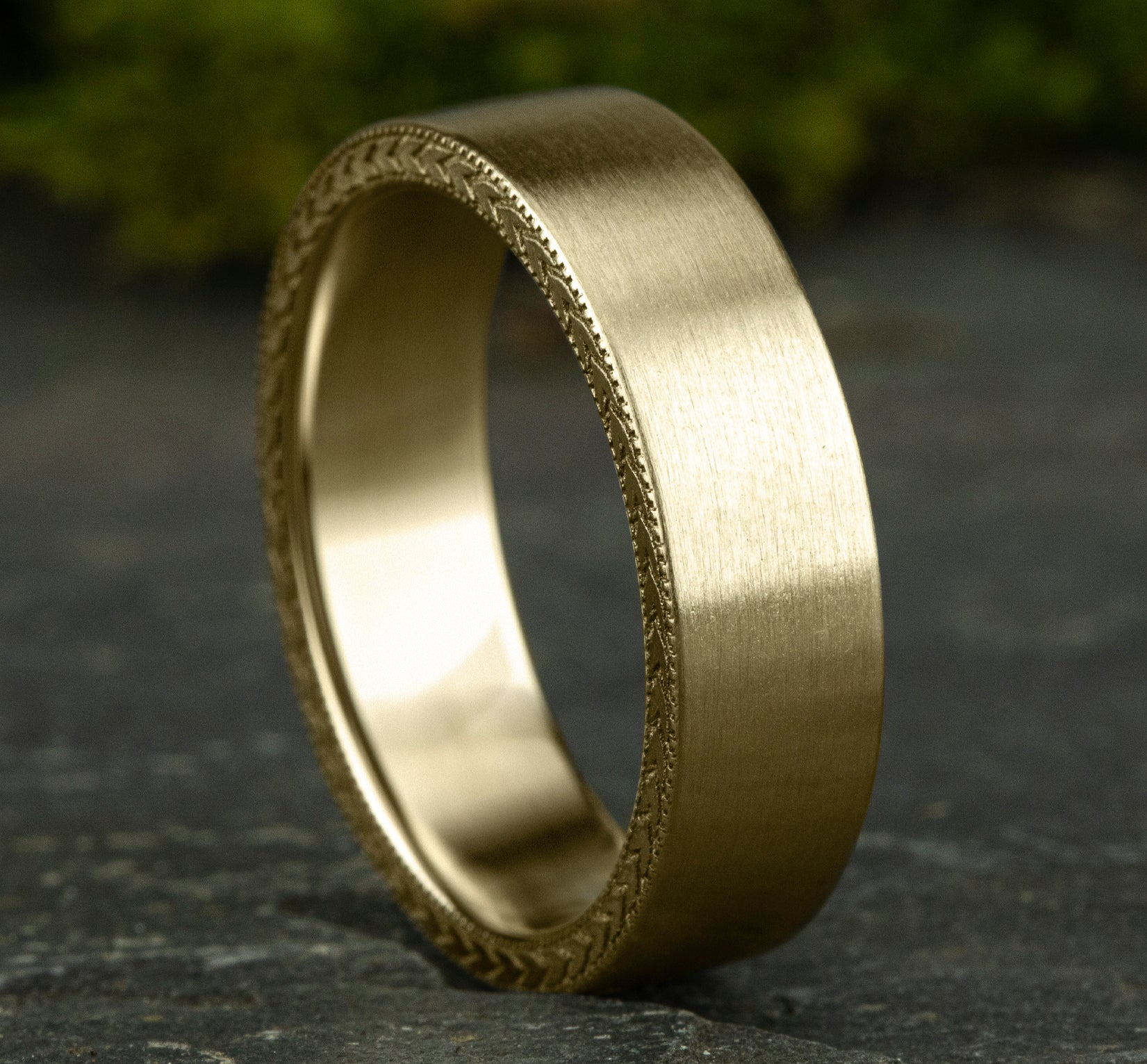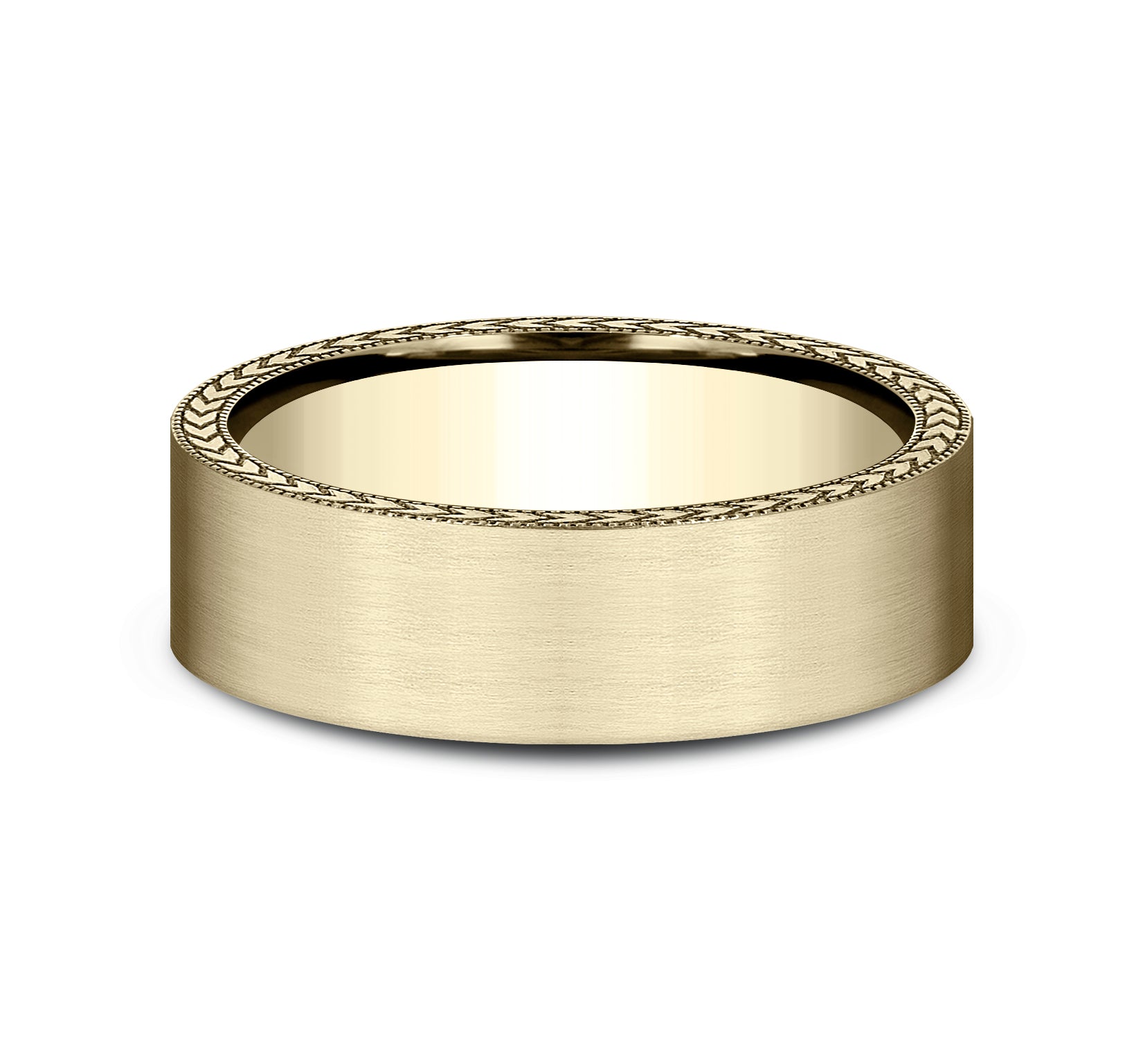 6.5mm, Comfort fit 14K Yellow Gold Satin finish, wheat patterned edges test