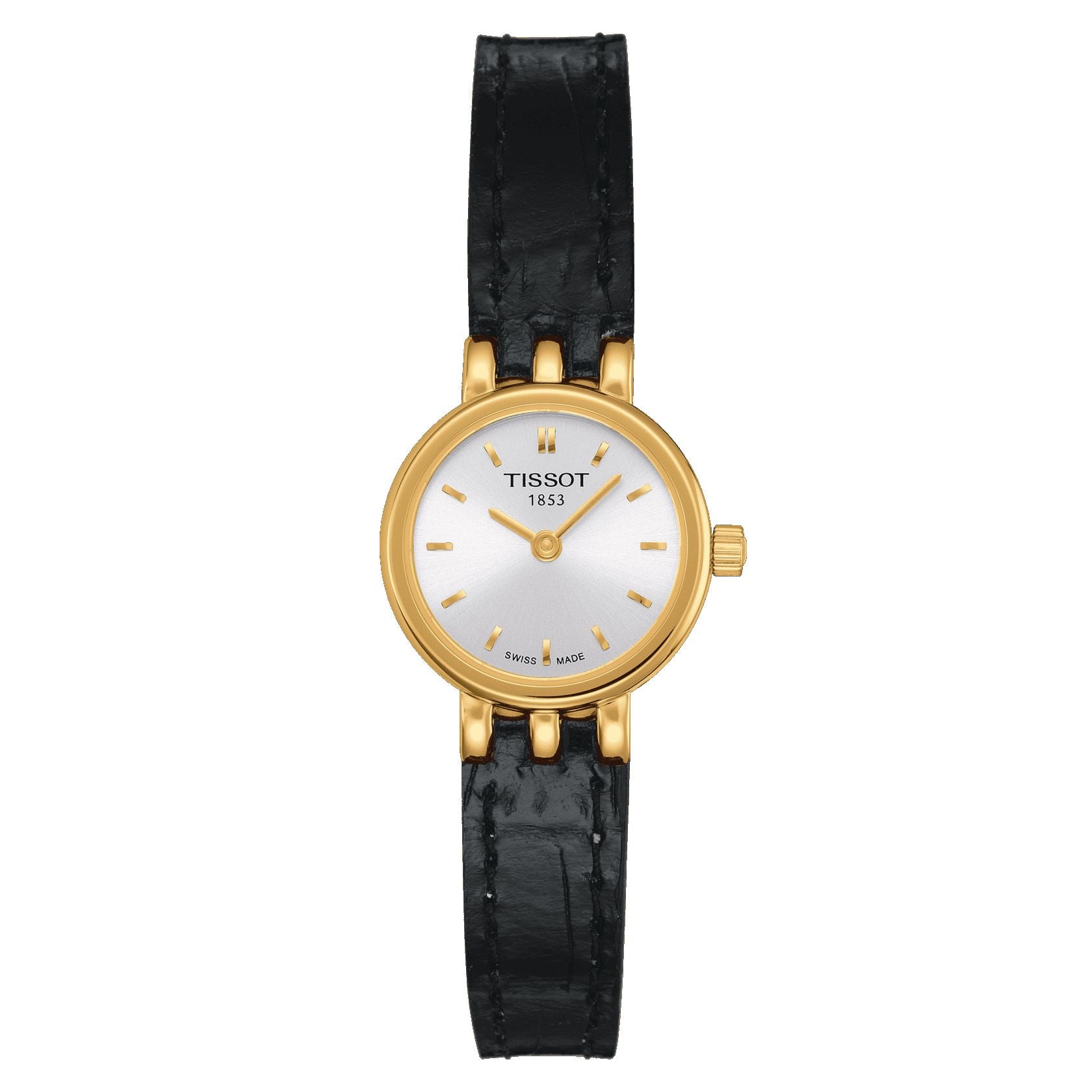 2 Years Of Warranty, Water-Resistant Up To A Pressure Of 3 Bar (30 M / 100 Ft), Length 19.50, Width 19.50, Thickness 5.00, Lugs 6.00, Round, 316L Stainless Steel Case With Yellow Gold Pvd Coating, Dial Silver, Indexes, Swiss Quartz, Eta 901.001, Quartz, Battery Type Renata 321, Leather, Black, Standard Buckle