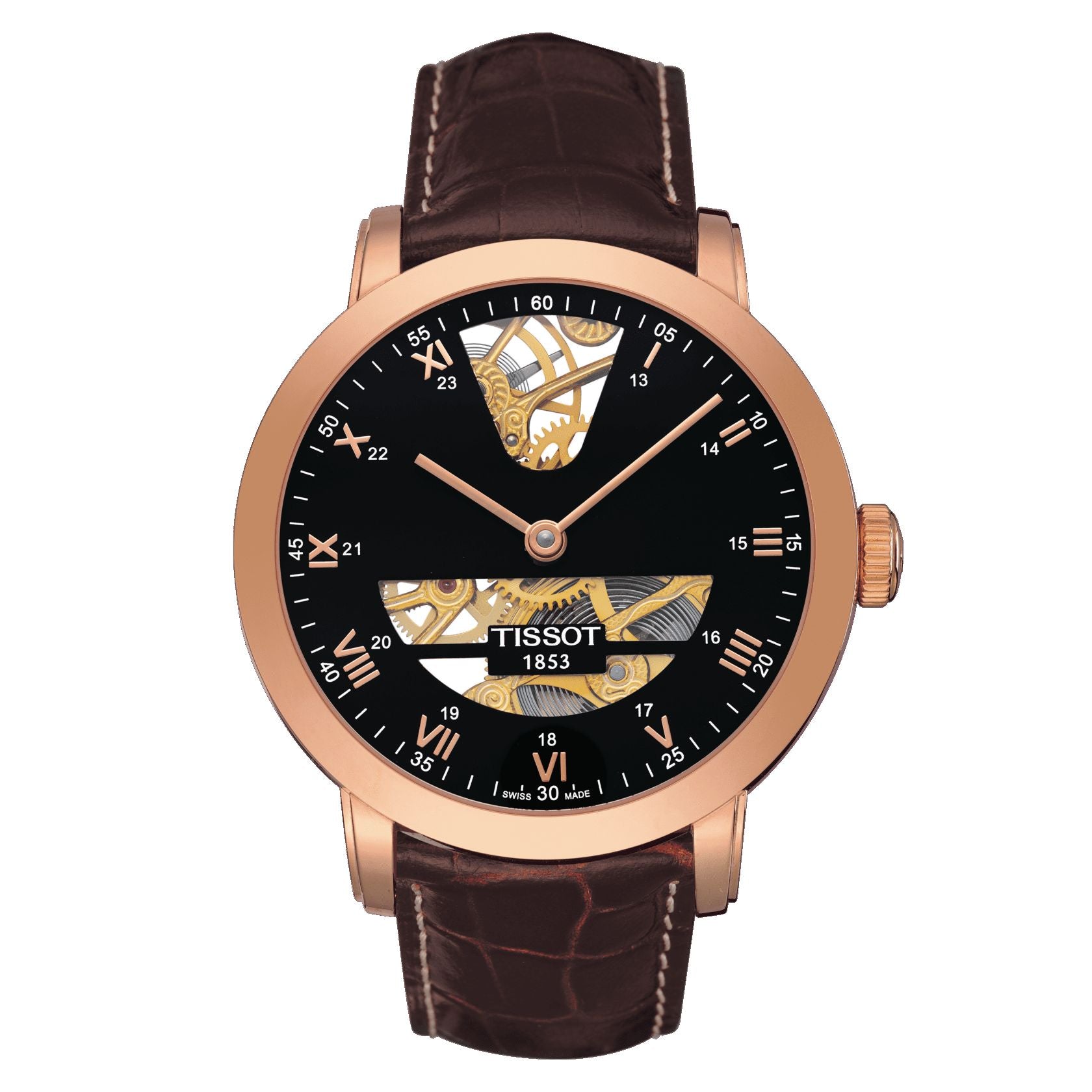 2 Years Of Warranty, Water-Resistant Up To A Pressure Of 3 Bar (30 M / 100 Ft), Length 42.50, Width 42.50, Thickness 11.57, Lugs 20.00, Round, 18K Rose Gold Case, Case See-Through Caseback, Dial Black, Roman, Swiss Mechanical, Eta 6497, Mechanical, Power Reserve Of 46 Hours, Leather, Brown, Butterfly Clasp