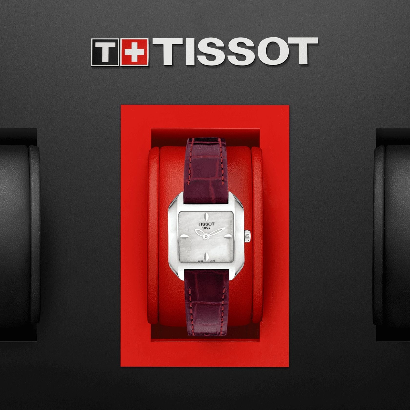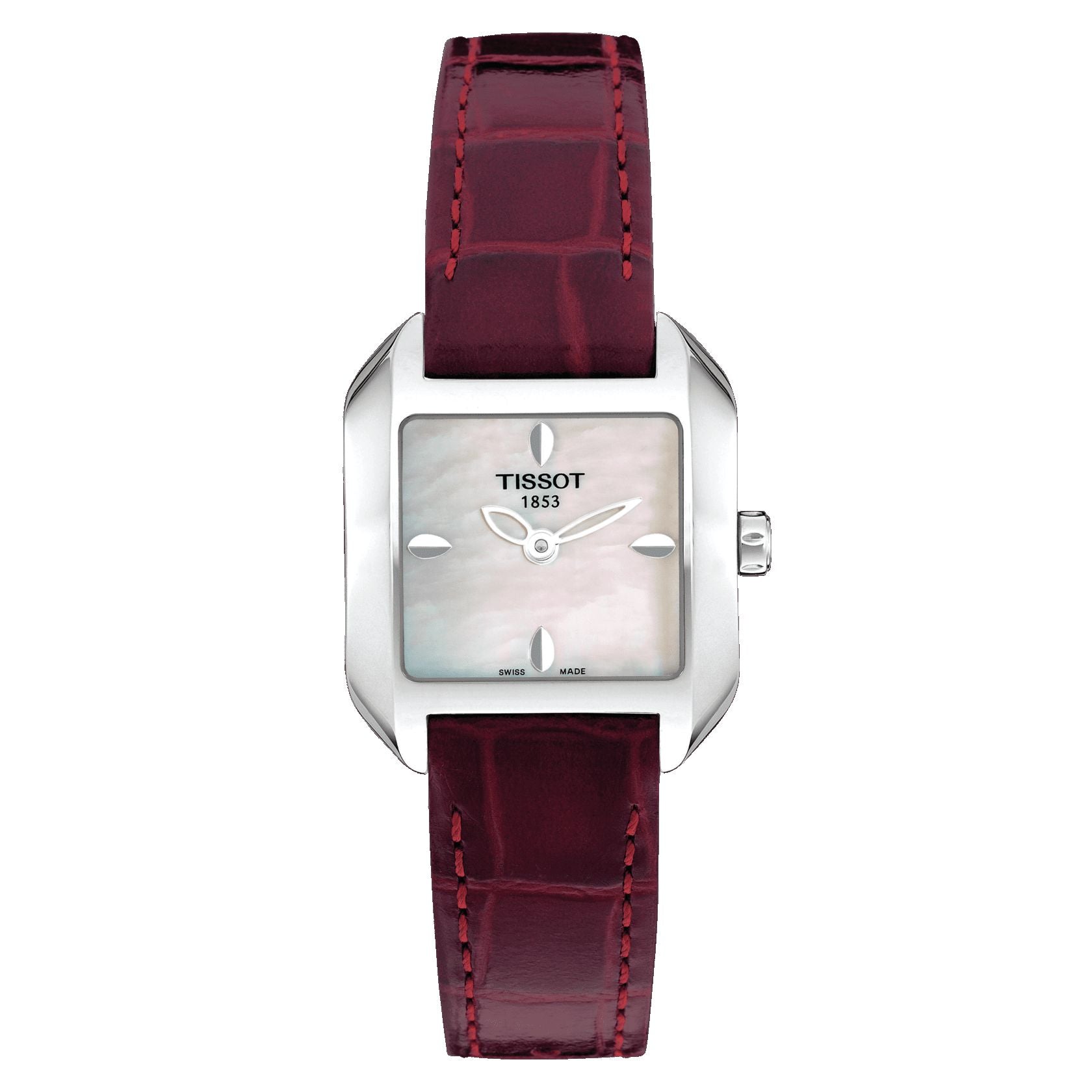 2 Years Of Warranty, Water-Resistant Up To A Pressure Of 3 Bar (30 M / 100 Ft), Length 20.20, Width 23.60, Thickness 7.20, Lugs 14.00, Square, 316L Stainless Steel Case, Dial White Mother-Of-Pearl, Indexes, Swiss Quartz, Eta 901.001, Quartz, Battery Type Renata 321, Leather, Red, Butterfly Clasp