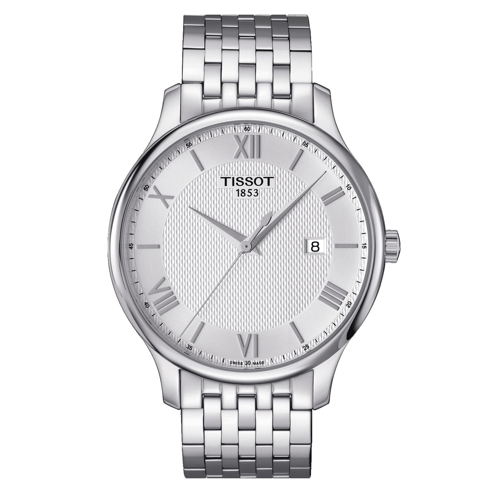 2 Years Of Warranty, Water-Resistant Up To A Pressure Of 3 Bar (30 M / 100 Ft), Length 42.00, Width 42.00, Thickness 7.47, Lugs 20.00, Round, 316L Stainless Steel Case, Dial Silver, Roman And Indexes, Swiss Quartz, Eta F06.111, Quartz Eol, Battery Type Renata 371, Eol (Battery End-Of-Life Indicator), Stainless Steel, Grey, Butterfly Clasp With Push-Buttons